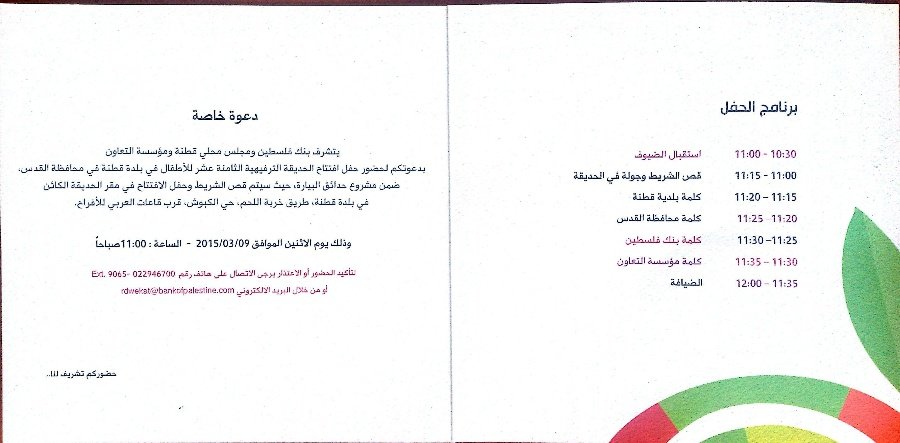 يتشرف مجلس محلي قطنة وبنك فلسطين ومؤسسة التعاون بدعوتكم لحضور حفل افتتاح الحديقة الترفيهية في بلدة قطنة ضمن مشروع حدائق البيارة ،حيث سيتم قص الشريط وحفل الافتتاح في مقر الحديقة الكائن في بلدة قطنة طريق خربة الم اللحم نحي الكبوش، قرب قاعات ابو العربي للافراح.